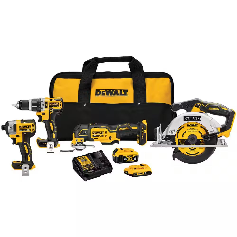 This 20V MAX* XR Brushless Cordless Combo Kit includes 4 tools, 20V MAX* 2.0Ah battery, 20V MAX* 4.0Ah battery, charger, and kit bag. The DCD796 20V MAX* XR Lithium Ion Brushless Compact Hammer Drill Kit is lightweight and compact for working in tight spaces for long periods of time. High-speed transmission delivers 2 speed variations allowing users to choose the level of performance needed for various applications. Comfort grip adds balance and control. DCF887 1/4 in. Brushless Cordless 3-Speed Impact Driver is a compact size (5.3 in. front-to-back length) and lightweight (3.4 lbs.) tool designed for working in confined spaces. Though the Impact Driver is lightweight and compact in size, it does not sacrifice performance with its brushless motor that delivers up to 1,825 in-lb of torque and 3,250 rpm for driving large-diameter screws. Combining performance and versatility, the DCS565 20V MAX* 6-1/2 in. Cordless Circular Saw is ready to take on a variety of cutting applications. It features a powerful brushless motor that delivers 4,950 rpm for fast, accurate, and consistent cutting. The DCS356 Oscillating Multi-tool comes with a 3-speed selector which will allow you to match the speed of the tool to your application giving you the final piece for precision. This kit is backed by a 3-year, limited warranty so you can buy with confidence.