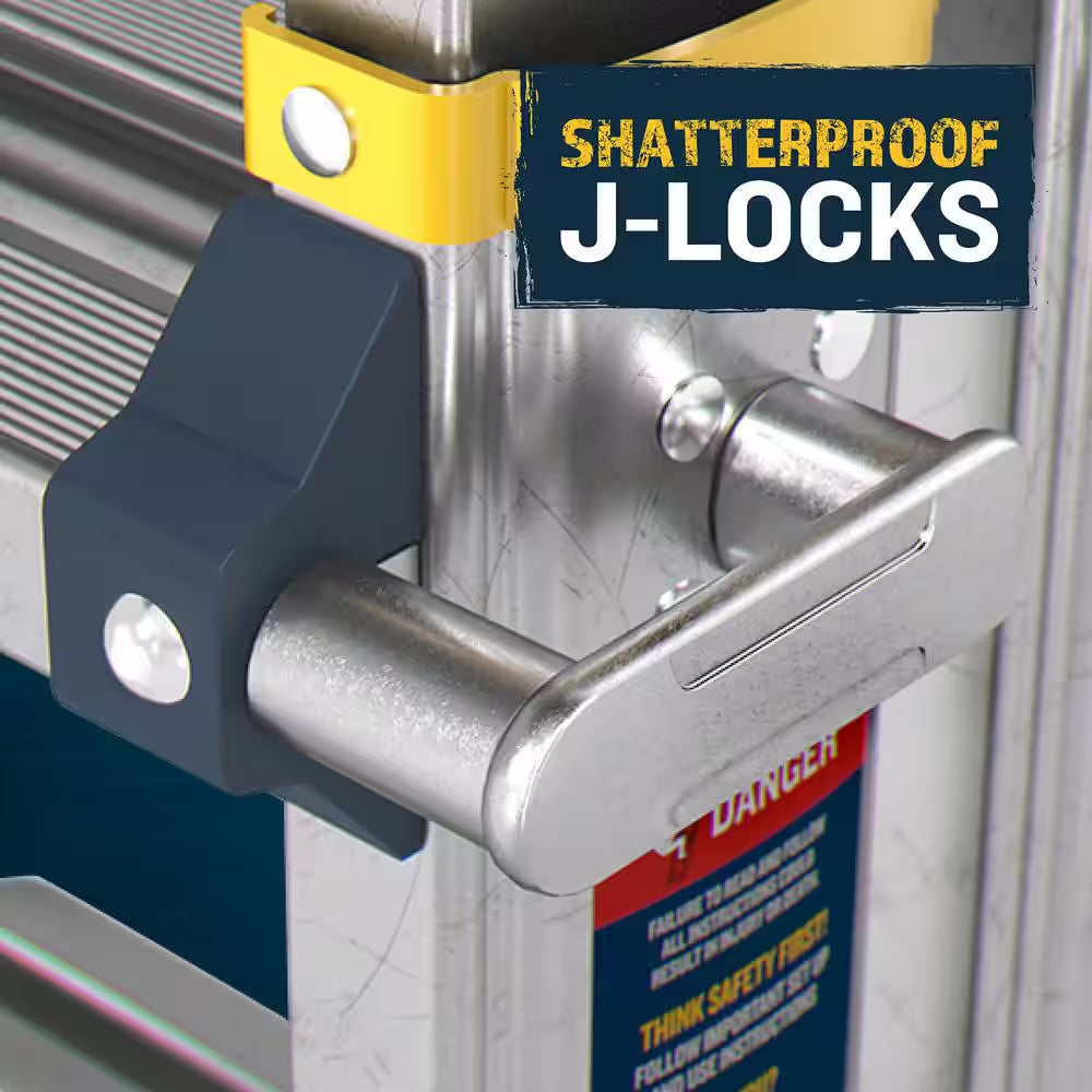 Werner's lightest weight 375 lbs. Multi-Position ladder, NOW includes Built-In Leveling. 2-ladder feet easily adjust with up to 7 in. of leveling capability. This 5-in-1 multi ladder adjusts to 32-positions, allowing you to do more jobs quickly and safely. Quickly adjust to use as an extension ladder, double-sided twin 2-person step ladder, stairway ladder, 90° wall ladder or as 2-self-supported scaffolding bases. The redesigned shatterproof aluminum j-locks are easy to use. Oversized impact resistant push knobs are more comfortable, and protect your ladder from damage. With its many uses, the new Multi-Position Pro with Leveling will fit all your climbing needs.