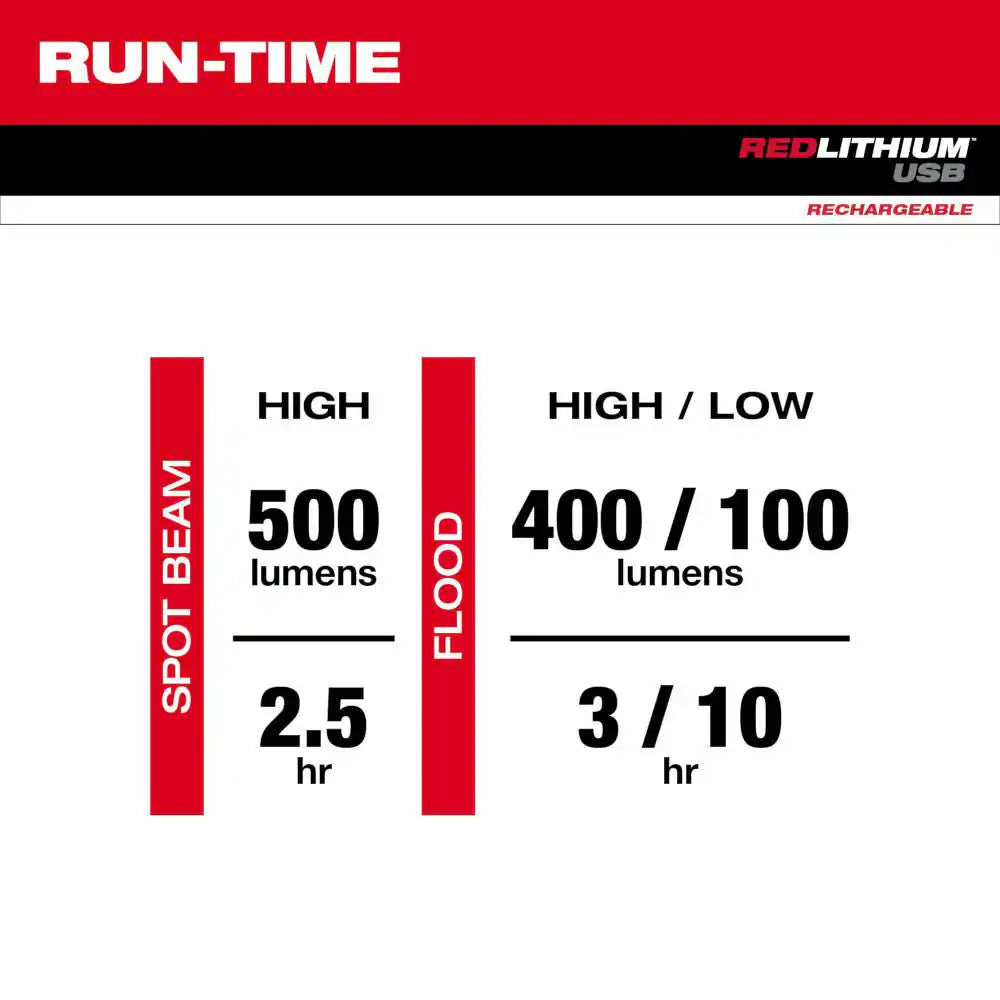 The MILWAUKEE REDLITHIUM USB Pivoting Flashlight offers high output in any task and any position. It's powered by REDLITHIUM USB, giving you high output light for any task from any position. The flashlight features spot and flood beam modes allowing you to change it from a high-powered flashlight to a versatile task light with the press of a button. With 500 lumens of TRUEVIEW High Definition Output and a 155-meter (377 feet) spot beam distance, it gives you the ability to search, trace, or inspect better from farther away. In flood mode, the LED flashlight's 110° pivoting light head and magnet base provides you with hands-free task light, while directing the light exactly where they need it. Maximize brightness or extend runtime with high and low flood mode options with up to 12 hours of runtime. Turn the flashlight into a right-angle light with a built-in pocket clip designed for chest pockets and straps. The REDLITHIUM USB Pivoting Flashlight is powered by the REDLITHIUM USB 3.0AH Battery, providing all-day run-time, more recharges, and 3x faster charge time. The MILWAUKEE REDLITHIUM USB Battery can be recharged in the flashlight via Micro USB or swapped out with additional REDLITHIUM USB Batteries for virtually no downtime. The MILWAUKEE REDLITHIUM USB Pivoting Flashlight is great for any trade professional looking for the ultimate lighting versatility and is covered by a limited lifetime warranty.