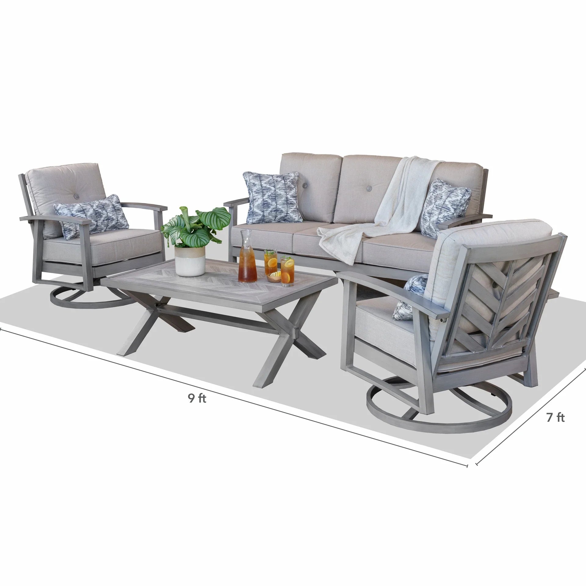 Reset your outdoor retreat with the SunVilla Harrington 4-Piece Deep Seating Set. Designed for both style and comfort, this ensemble comprises a deep-cushioned three-seat sofa, two swivel rocker club chairs, and a 44″ rectangular tile-top coffee table—complete with accent throw pillows and a weather-resistant cover. Upholstered in Sunbrella® performance fabric over high-density, high-resiliency foam, each seat envelops you in plush comfort that softens over time. Powder-coated aluminum frames, hand-finished in a grey-brushed weathered look, display a cohesive chevron motif echoed on chair backs, table tiles, and leg criss-crosses. Built to withstand the elements, the set’s durable materials ensure your outdoor living space remains inviting season after season.