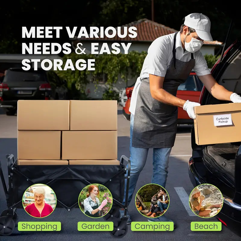 Haul more—faster and with less strain. This Heavy-Duty All-Terrain Folding Cart is a rugged, compact solution for campers, gardeners, sports teams, and shoppers who need serious carrying capacity without the bulk. Choose from three capacity tiers (220 lb, 450 lb, or 680 lb) to match your workload. Powder-coated steel frames, reinforced deck panels, and large all-terrain wheels make moving coolers, tools, firewood, plants or market loads effortless across grass, gravel, sand, and pavement. When the job’s done, it folds flat for compact storage in trunks, sheds, or RV bays. Built for real life—not just showroom pictures.