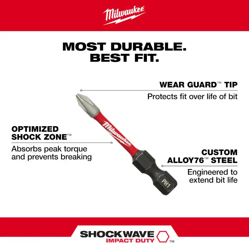 The MILWAUKEE SHOCKWAVE Impact Duty 40PC Driver Bit Set is engineered to be the Most Durable, Best Fitting driver bits on the market. The WEAR GUARD TIP delivers increased wear resistance which protects the impact bit's fit over the life of the bit. The SHOCK ZONE is optimized for each tip type and length of driver bit in the set to absorb peak torque and prevent breaking. The driver bits are made from CUSTOM ALLOY76 steel and a proprietary heat treatment process to extend bit life, providing up to 50X life versus other impact driver bits on the market. The Milwaukee SHOCKWAVE Impact Duty driver bits are built to provide users with extreme durability for the most demanding applications. The set is organized in a customizable accessory case designed for use in PACKOUT.