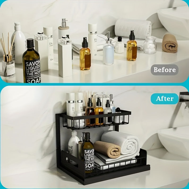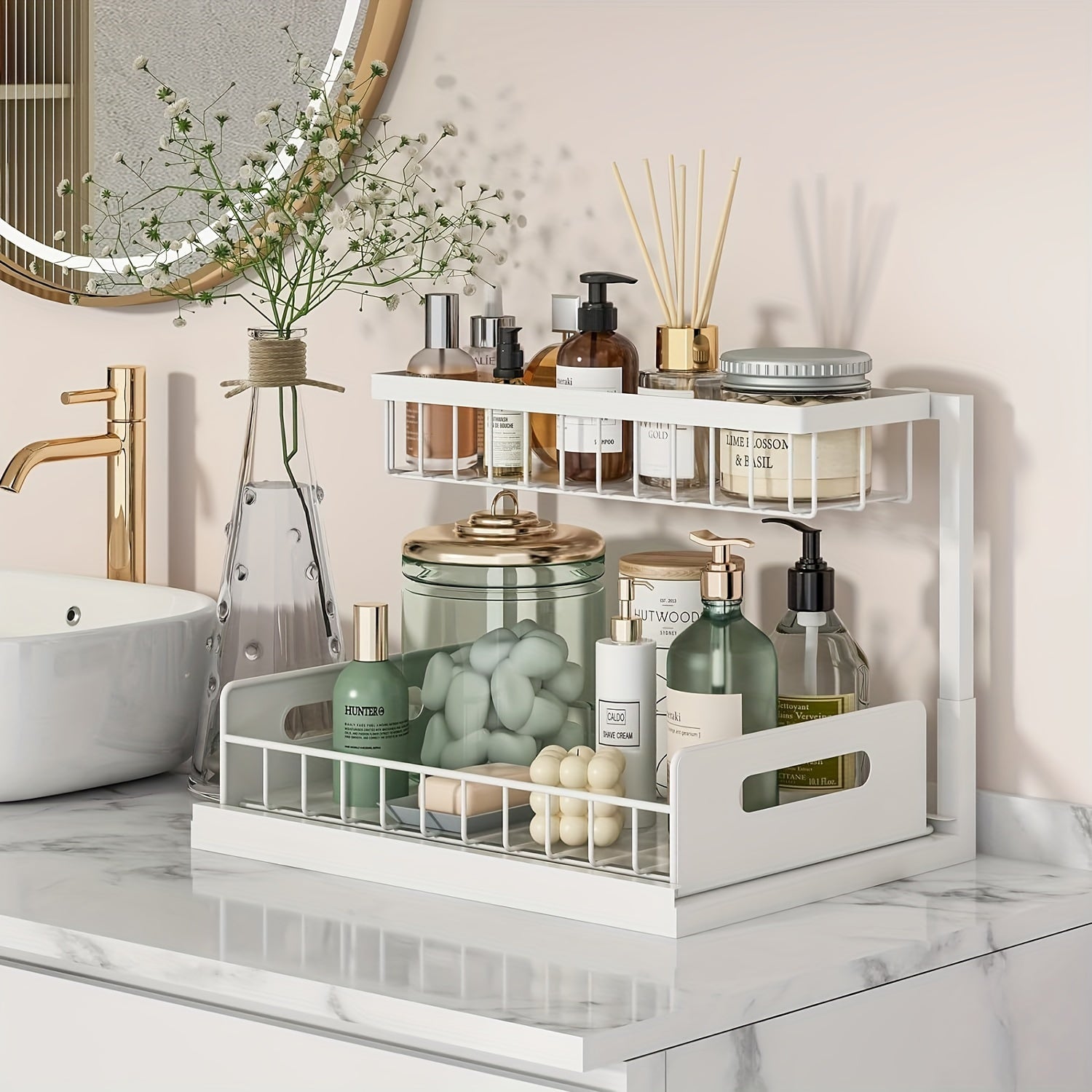 Maximize your cabinet space with this 2-pack of 2-layer under-sink pull-out organizer racks. Each sturdy steel rack measures 13.78″ deep by 10.83″ wide and features adjustable-height tiers to accommodate cleaning supplies, toiletries, or pantry items. Smooth-glide ball-bearing slides allow effortless extension for quick access, while the durable powder-coated finish resists rust and moisture. Ideal for kitchen or bathroom cabinets, these versatile storage racks install easily under sinks, in closets, or in utility rooms—transforming cluttered spaces into neatly organized zones. An excellent gift for Mother’s Day, teacher appreciation, or anyone who loves practical home organization solutions.