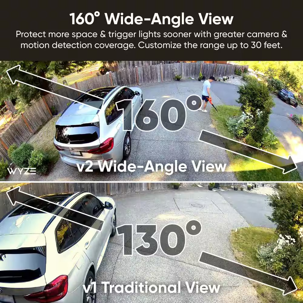 - 160° wide-angle view + 270° PIR Motion Detection-Protect more space and trigger lights sooner with greater camera and motion detection coverage in all directions. Customize the detection range up to 30 feet.