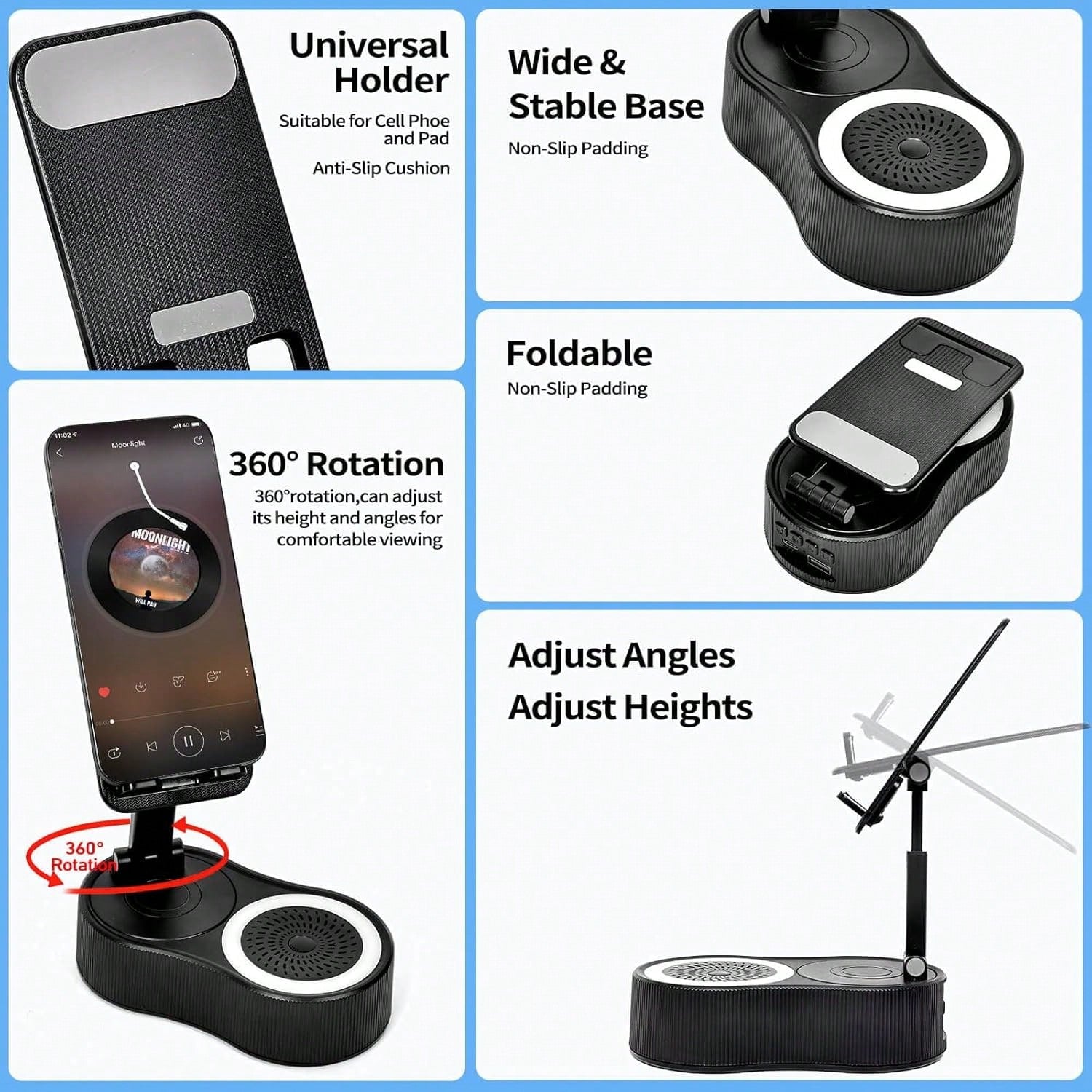 Wireless Induction Bluetooth Speaker 5-in-1 Phone Holder – 2025 Rechargeable Foldable Speaker with Ambient Light